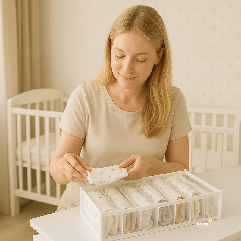 As colmeias são perfeitas para organizar o enxoval do bebê. Com divisórias ajustáveis, você consegue separar bodies, meias, fraldas e acessórios, mantendo tudo no lugar e de fácil acesso. Além disso, modelos em tecido macio garantem conforto e segurança.